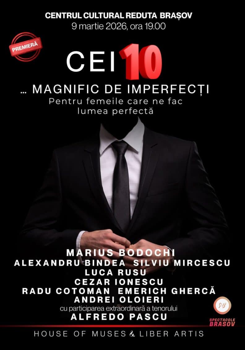 💫„Cei 10… magnific de imperfecți” este un spectacol-manifest despre relația dintre femei și bărbați, despre admirație, vulnerabilitate, putere și echilibru, spus printr-o combinație rafinată de teatru, muzică și confesiune artistică. Muzica spectacolului aduce accente pasionale inspirate de universul lui Astor Piazzolla, unde ritmul și emoția se împletesc într-o expresie intensă și elegantă. Pe scenă, nouă artiști creează un dialog viu între cuvânt și muzică, fiecare aducând propria energie și expresivitate. Cel de-al zecelea se naște pe scenă din fiecare dintre ei — bărbatul ideal, alcătuit din fragmente, așa cum îl visează toate femeile.
